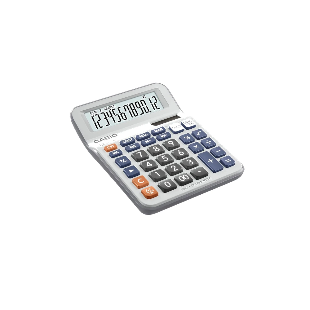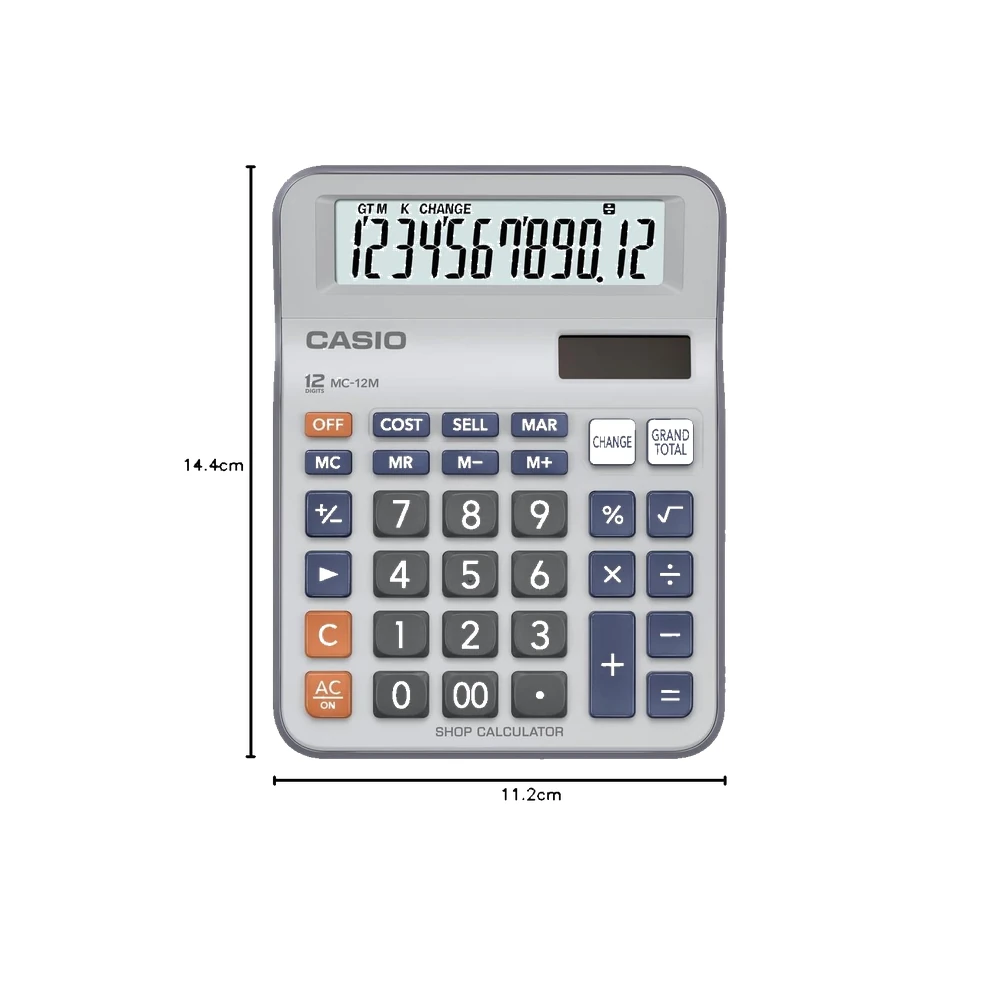 The Casio MC-12M is a 12-digit shop calculator with a unique “Change” function for fast and easy calculations. Its compact design and reliable keys make it an essential tool for retail and shop use. HSN Code: 84701000.