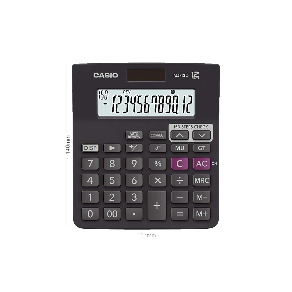 The Casio MJ-12D is a compact 12-digit basic calculator with an extra-large display, making it easy to read. Its 150-step check and correct function is perfect for verifying long calculations. HSN Code: 84701000.