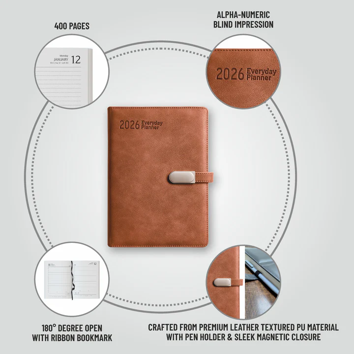 This Diary is a combination of Charming Looks with Subtle Functionality. Alpha-Numeric Blind Impression with Pen holder & Magnetic Loop Closure. Crafted from Premium Leather Textured PU Material. Natural Shade Paper