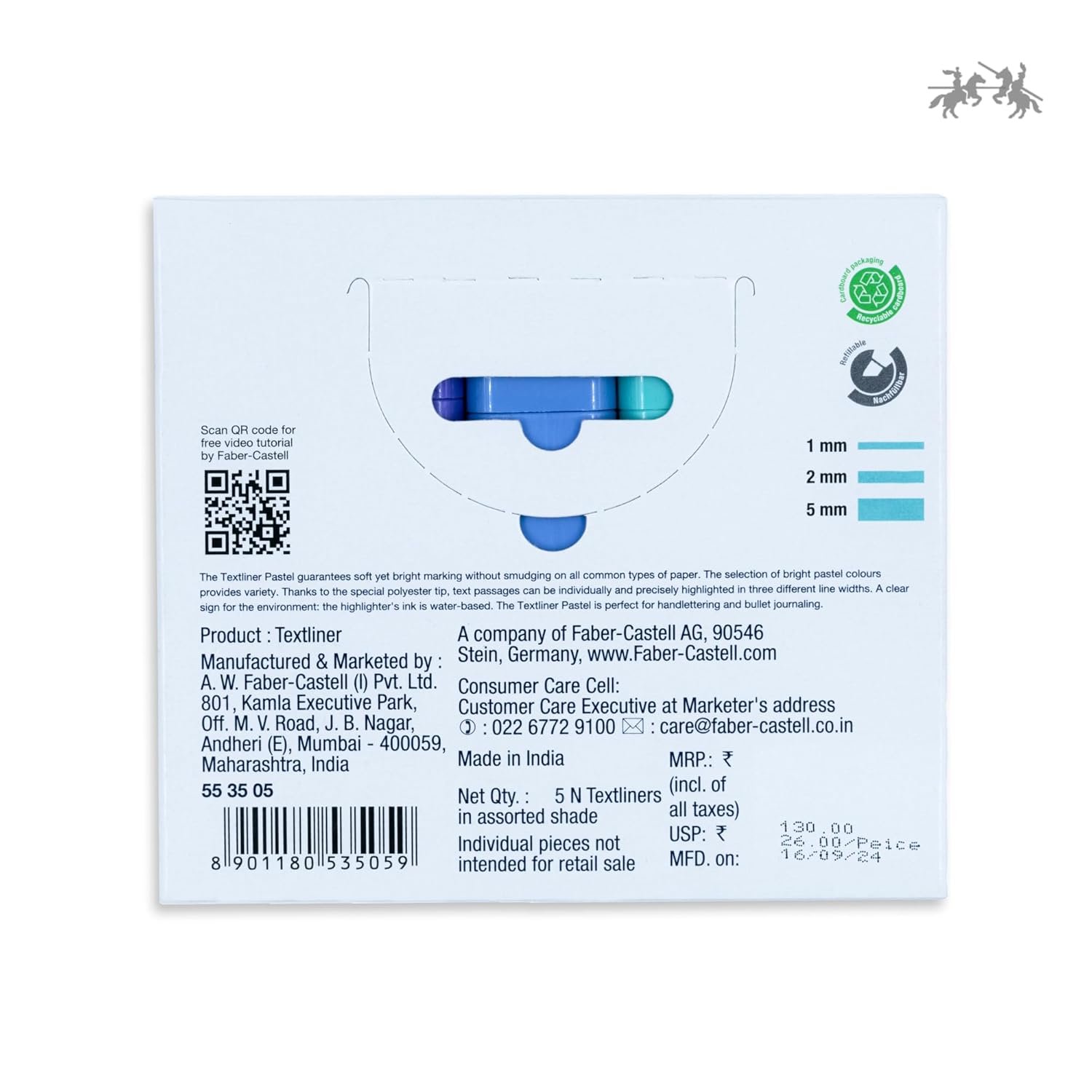 This set of 5 pastel Faber-Castell textliners/highlighters provides a range of soft, subtle colors. The chisel tip allows for both broad and fine highlighting, making it a versatile and stylish tool for students and professionals. HSN Code: 96082000.