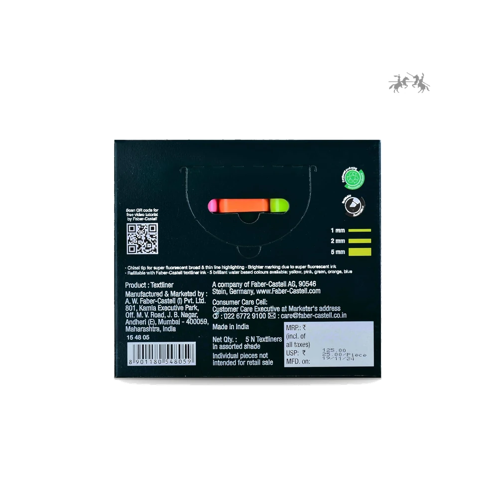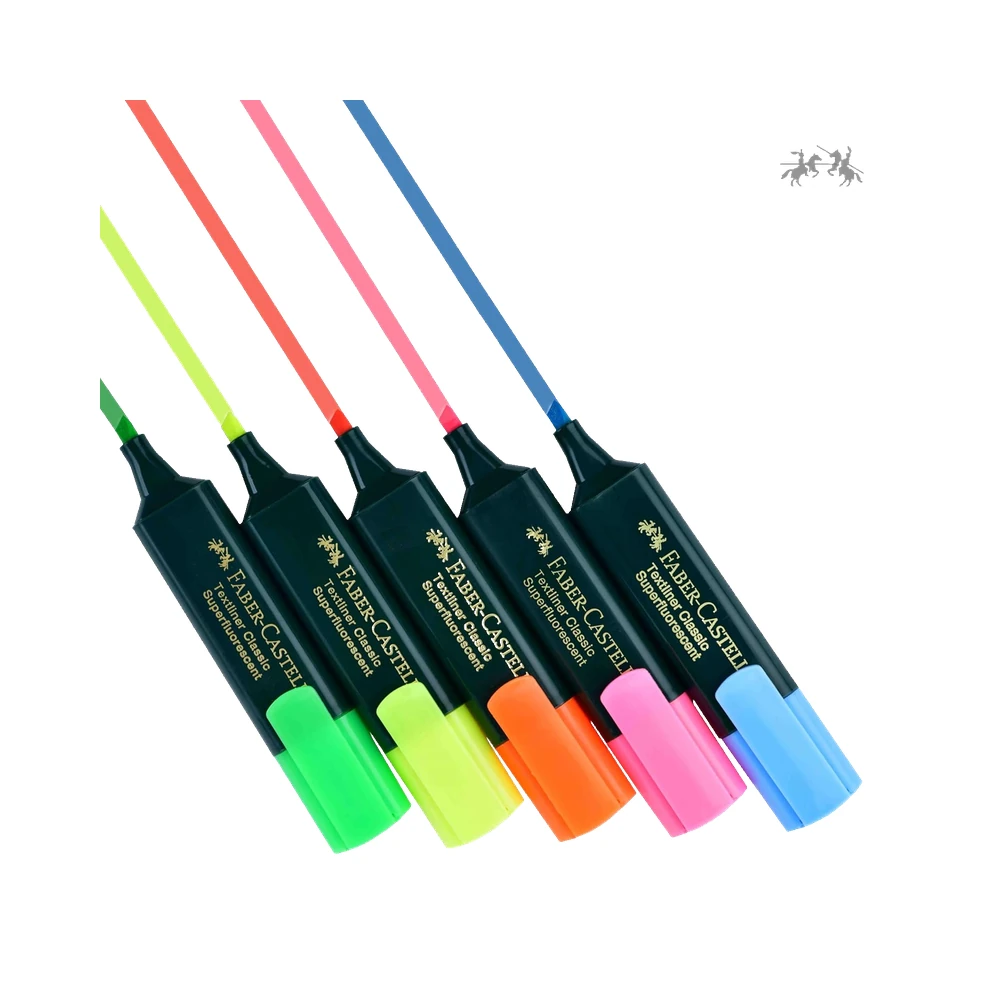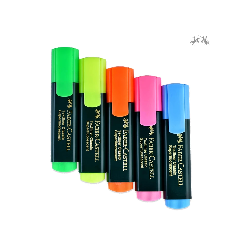Set of 5 regular Faber-Castell textliners/highlighters. Vibrant, fluorescent colors. Versatile chisel tip for broad and fine highlighting.