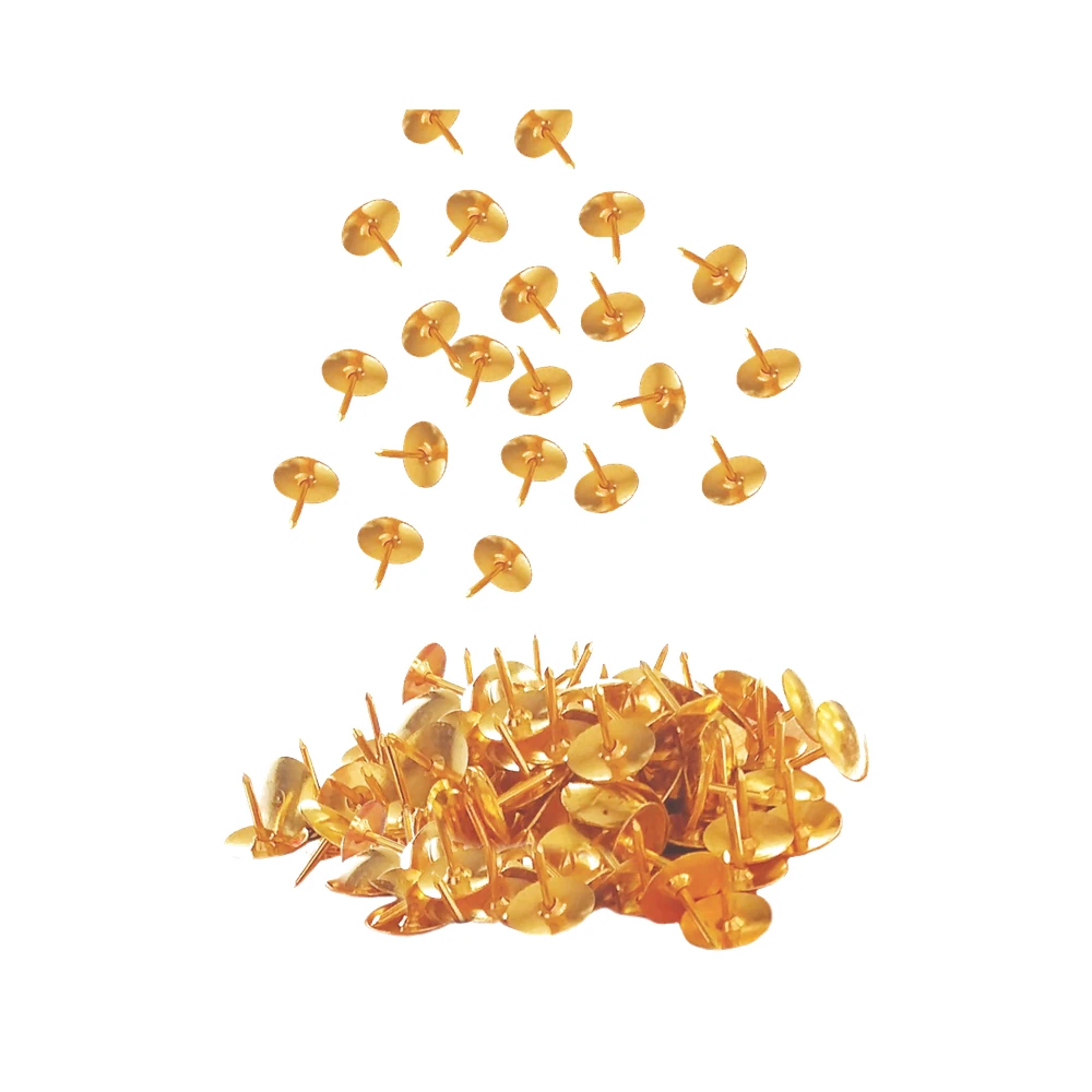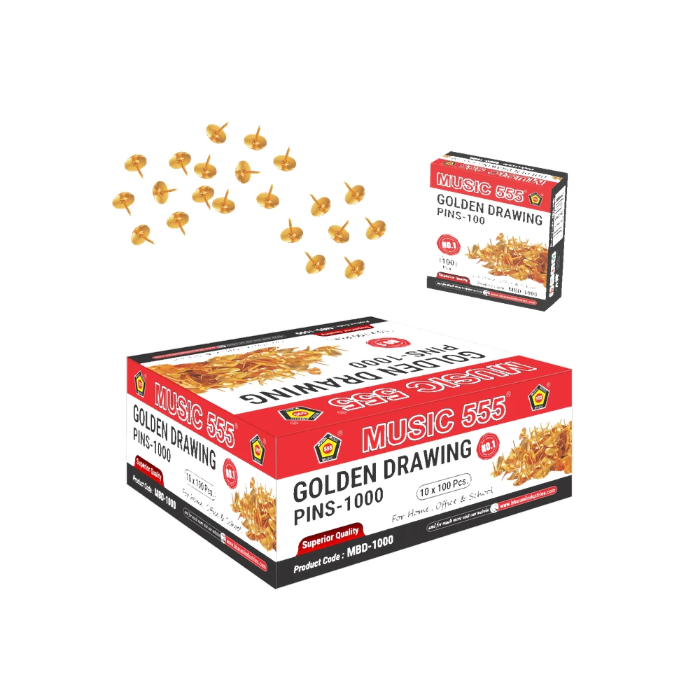 This box contains 100 pieces of golden thumbtacks from Music 555. These thumbtacks are designed for durability and a smooth finish, making them perfect for pinning important notes, photos, and documents on bulletin boards and cork boards.