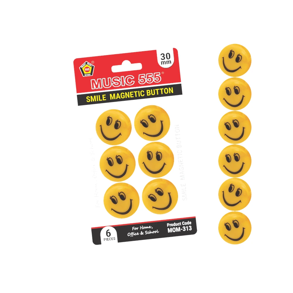 This pack of 6 magnetic smiley face buttons from Music 555 is perfect for adding a fun and cheerful touch to your whiteboard. The strong magnets ensure a firm grip without damaging documents. HSN Code: 85051900.