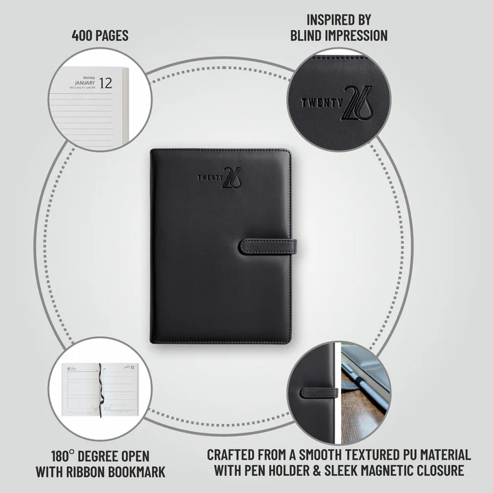 A Star in the making, Crafted from a Smooth textured PU Material. This Diary is Loaded with Functionality & Oomph, with its Water Inspired Blind Impression with Pen holder & Sleek Magnetic Closure. Natural Shade Paper