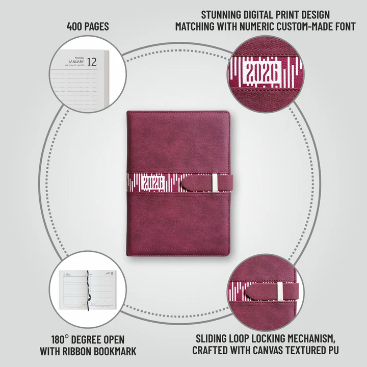 Slide Diary gets its name from the Sliding Loop Locking mechanism. It is crafted with Canvas textured PU with stunning Digital printed Design in centre. Elevating the Aura with Matching Numeric Custom-made Font. Natural Shade Paper, Pen Loop